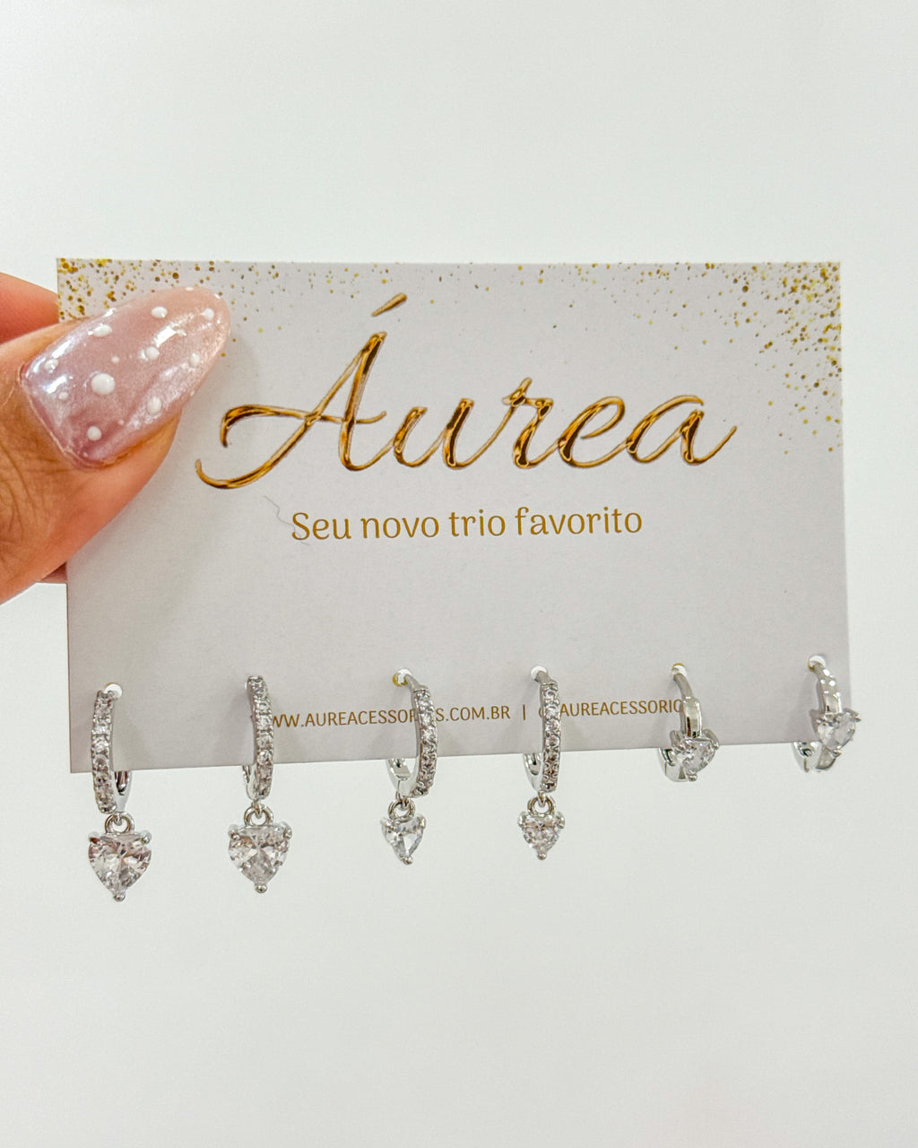 Trio de Brincos Argolas Pingente Coração - Semijoia Folheada a Prata