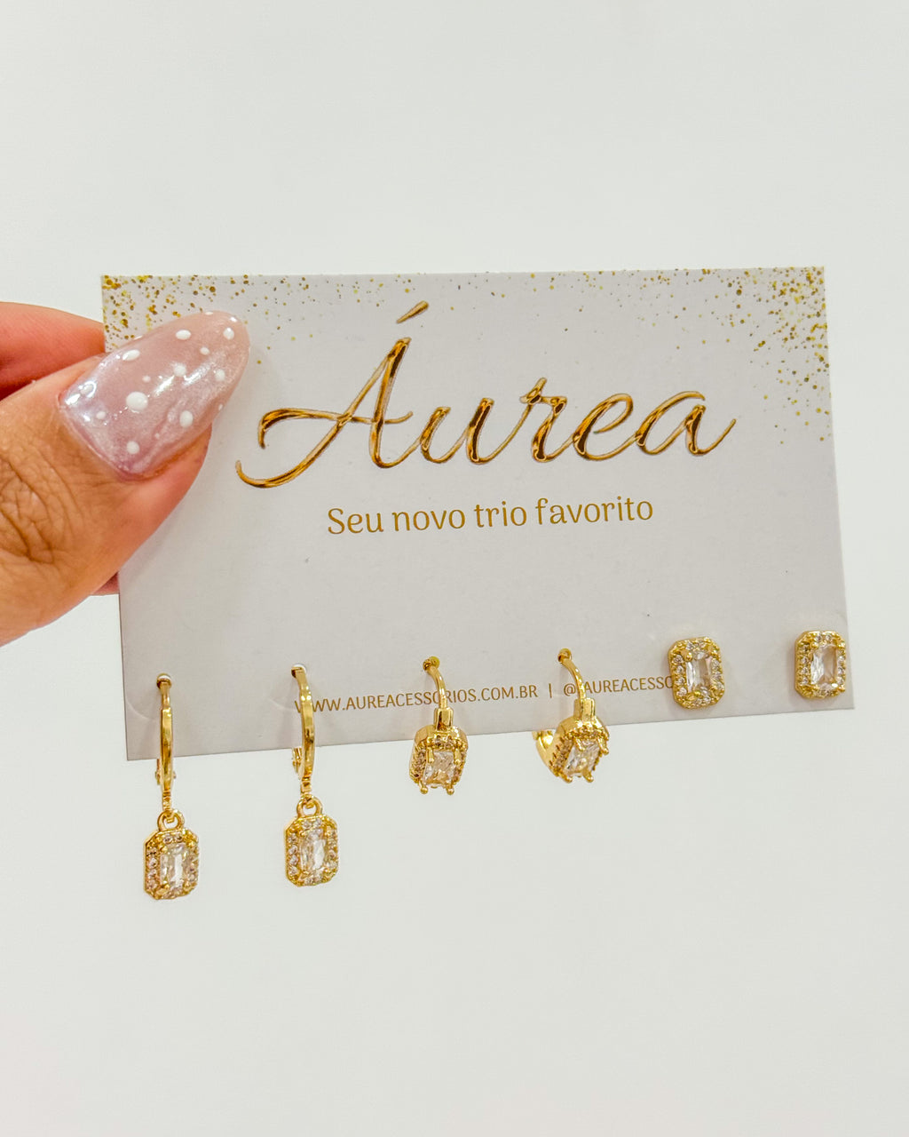Trio de Brincos Zircônia Quadrada Cravejada - Semijoia Folheada a Ouro 18k